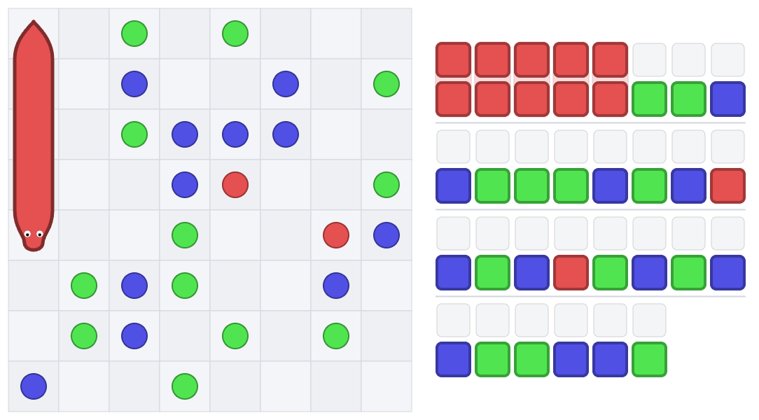 今回のコンテストには世界中から1,200人以上が参加。盤面上で蛇を動かし、色付きの餌を適切な順番で食べることで目標の色列をできるだけ短いターン数で再現する問題が出題されました。