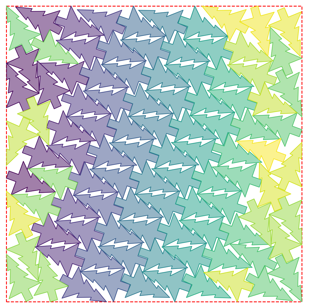 今回のコンテストには世界中から3,357チームが参加。クリスマスツリー型のピースを、できるだけ小さな正方形の箱に収める問題が出題されました。